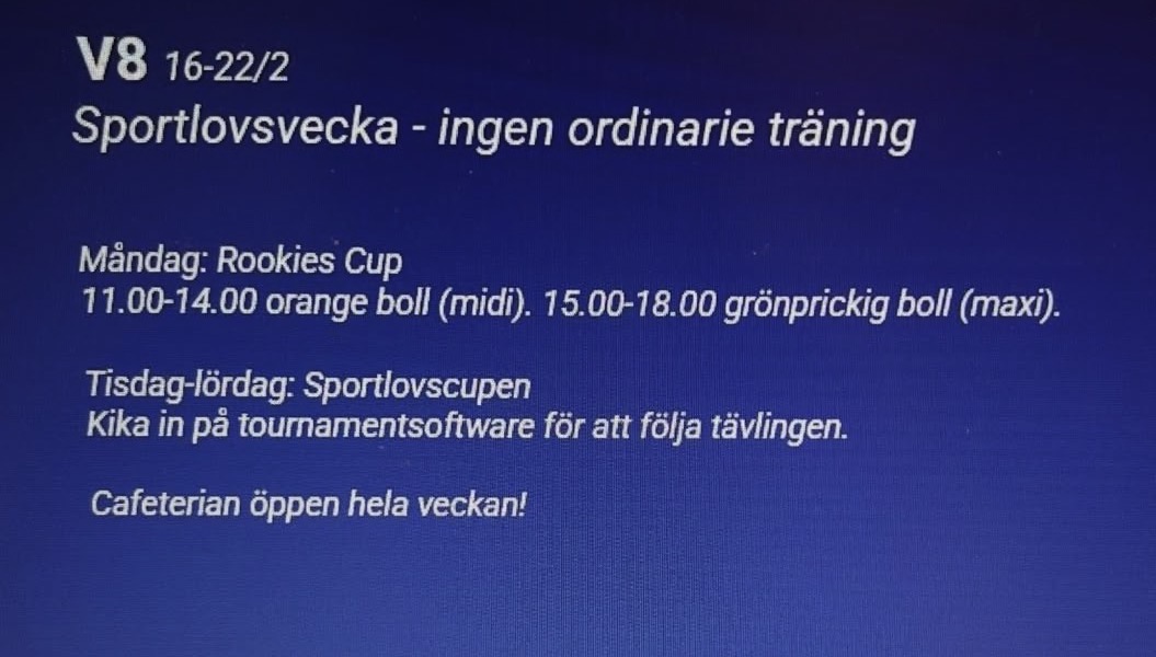 LejonhallenVECKA 8Må 11.00 Rookies Cup Ti 09.00 Vbg SportlovscupOn 10.00 Vbg SportlovscupTo 10.00 Vbg SportlovscupFr 13.00 Vbg SportlovscupLö 09.00 Vbg Sportlovscup