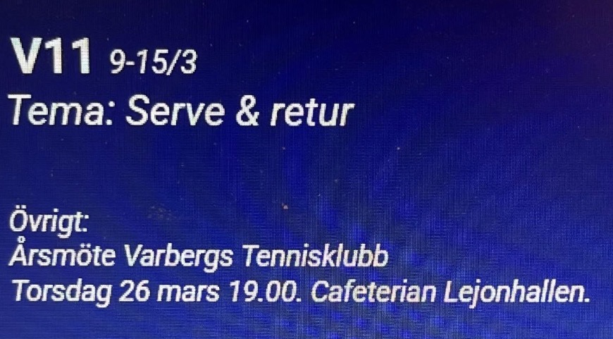 LejonhallenVECKA 11Må 12.00 LunchtennisTi 17.00 TisdagsdubbelnOn 12.00 Lunchtennis Fr 12.00 Lunchtennis Lö 14.00 B-lag vs Munka LjungbyLö 14.30 D55 vs GLTKSö 11.00 D45 vs Kullabygden