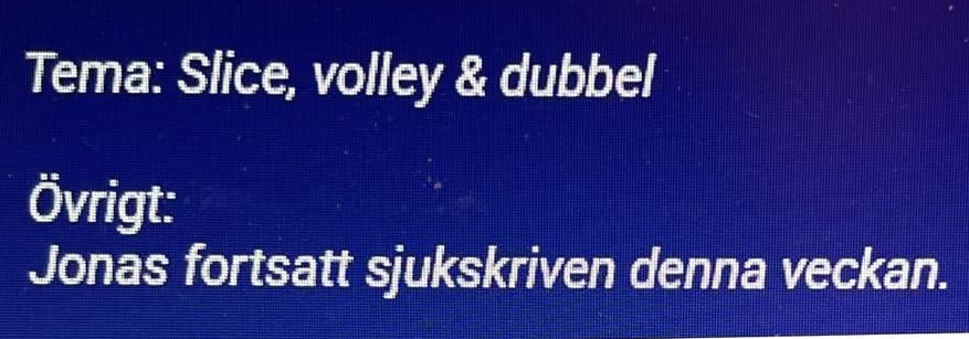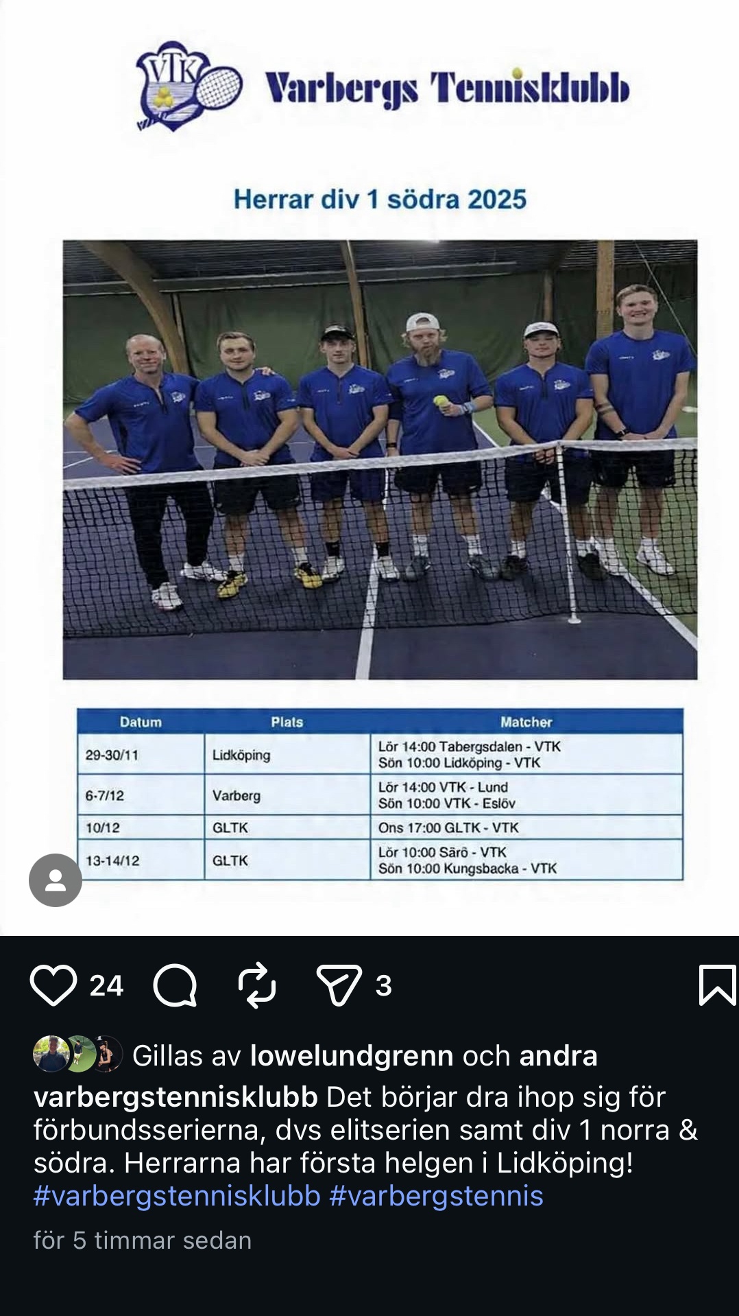 LejonhallenVECKA 47Må 12.00 LunchtennisTi 10.00 D55 vs BrottkärrTi 17.00 TisdagsdubbelnOn 12.00 Lunchtennis To 11.00 H70 vs UlleviFr 12.00 Lunchtennis Lö 14.00 H45 vs FalkenbergLö 14.00 B-lag vs SmålandsstenarSö 10.00 Damlag vs Elfsborg